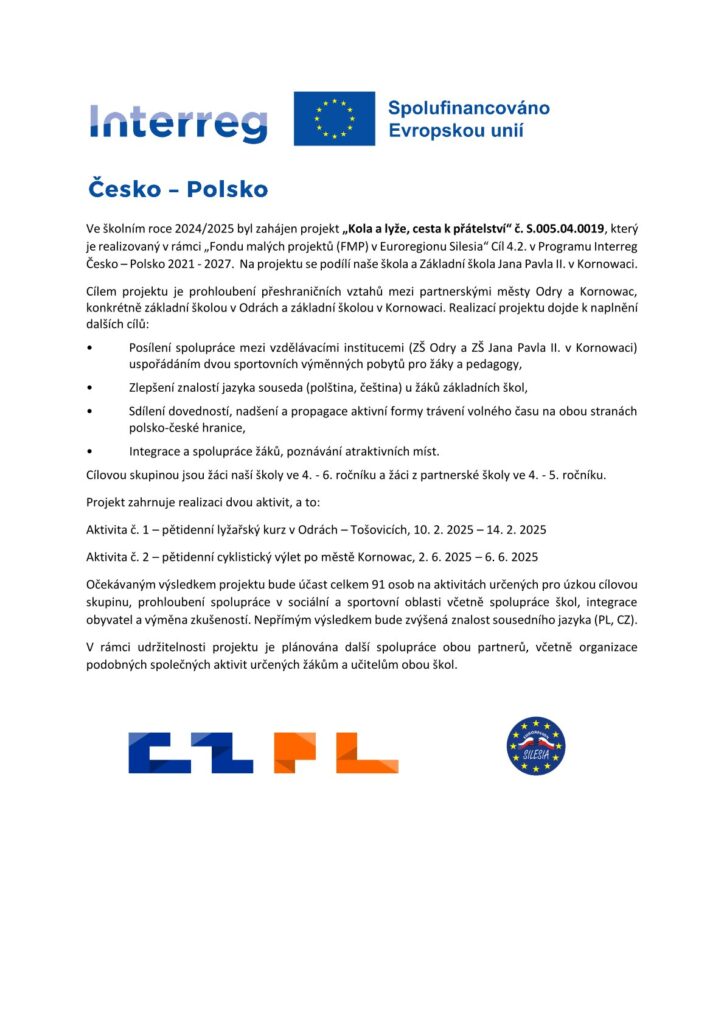 Informace o projektu „Kola a lyže, cesta k přátelství“ č. S.005.04.0019, který je realizovaný v rámci „Fondu malých projektů (FMP) v Euroregionu Silesia“ Cíl 4.2. v Programu Interreg Česko – Polsko 2021 – 2027.