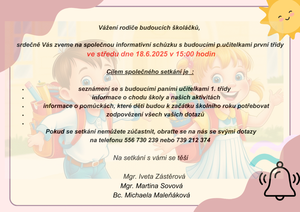 srdečně vás zveme na informativní schůzku, která se uskuteční ve středu 18. 6. od 15:00 hodin v naší škole. Setkáte se s budoucími třídními učitelkami vašich dětí, které v září poprvé nastoupí k povinné školní docházce.