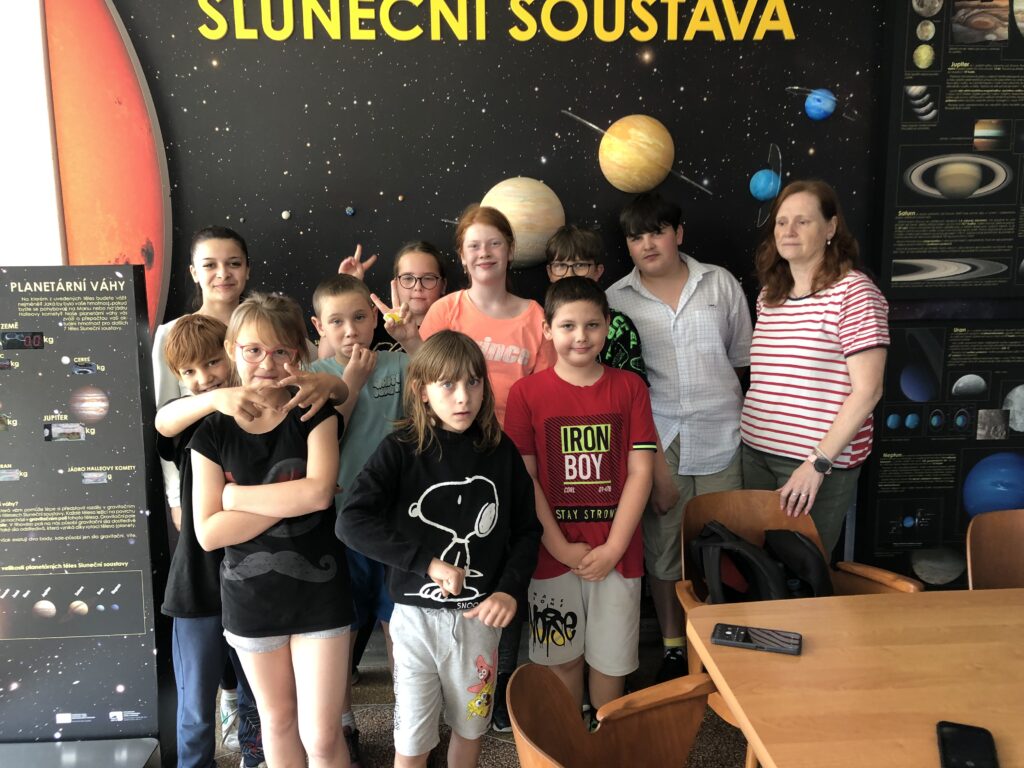 Celé dopoledne jsme příjemně strávili mezi planetami sluneční soustavy, hvězdami, raketami. Dozvěděli jsme se také mnoho informací o letech do vesmíru, sami jsme pouštěli raketu do vzduchu, pozorovali jsme Slunce, Venuši. Po obědě jsme jeli na náměstí, kde jsme si nakoupili zmrzliny a dárky, utratili poslední peníze a jeli jsme domů. Výlet se nám všem velmi líbil.