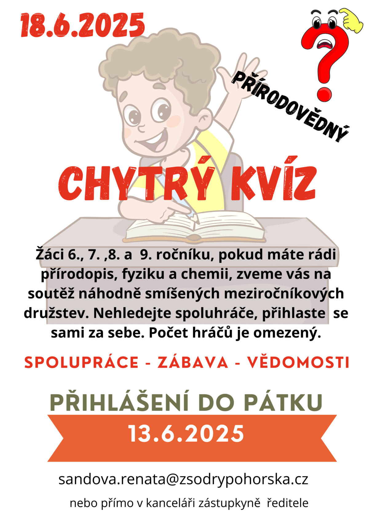 baví tě chemie, fyzika nebo přírodopis? Chceš zažít napětí, týmovou spolupráci a trochu přemýšlení? Pak neváhej a přihlas se na Chytrý kvíz – soutěž pro zvídavé žáky 2. stupně.