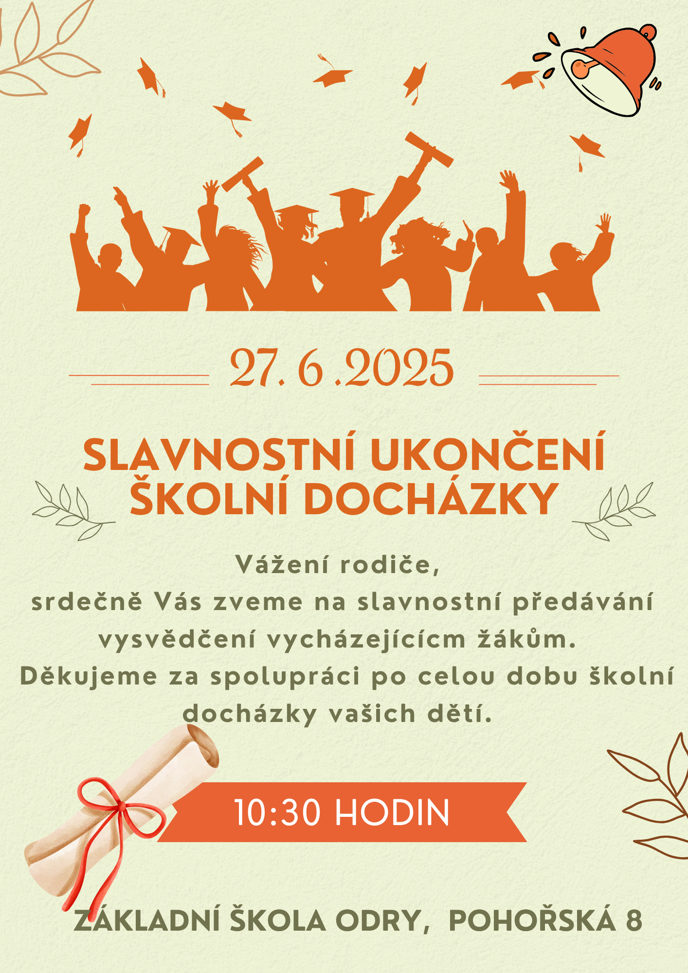 dovolujeme si Vás srdečně pozvat na slavnostní předávání vysvědčení vycházejícím žákům, které se uskuteční v pátek 27. června 2025 v 10:30 v prostorách školy.