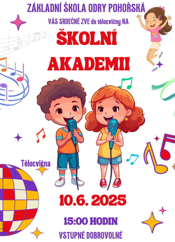 srdečně Vás 10.6.2025 od 15:00 hodin zveme na naši školní akademii, kterou pro Vás s radostí připravují Vaše děti společně se svými vyučujícími.