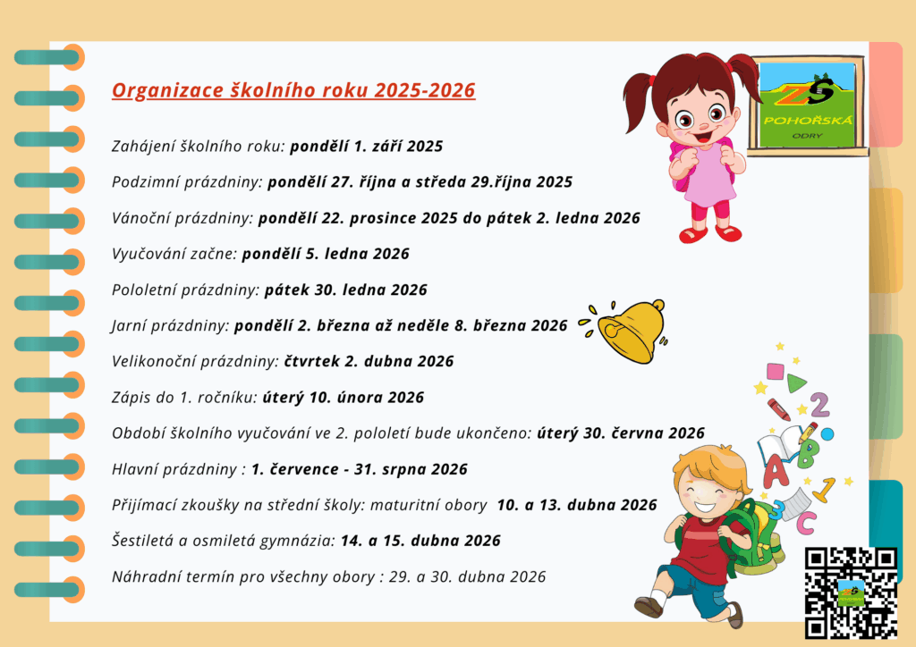 Připomínáme, že v pondělí 1. září 2025 bude zahájen školní rok 2025/26. Začátek výuky je 7:50 hod. Předpokládaná délka výuky první den bude čtyři vyučovací hodiny tj. do 11:30 hod.