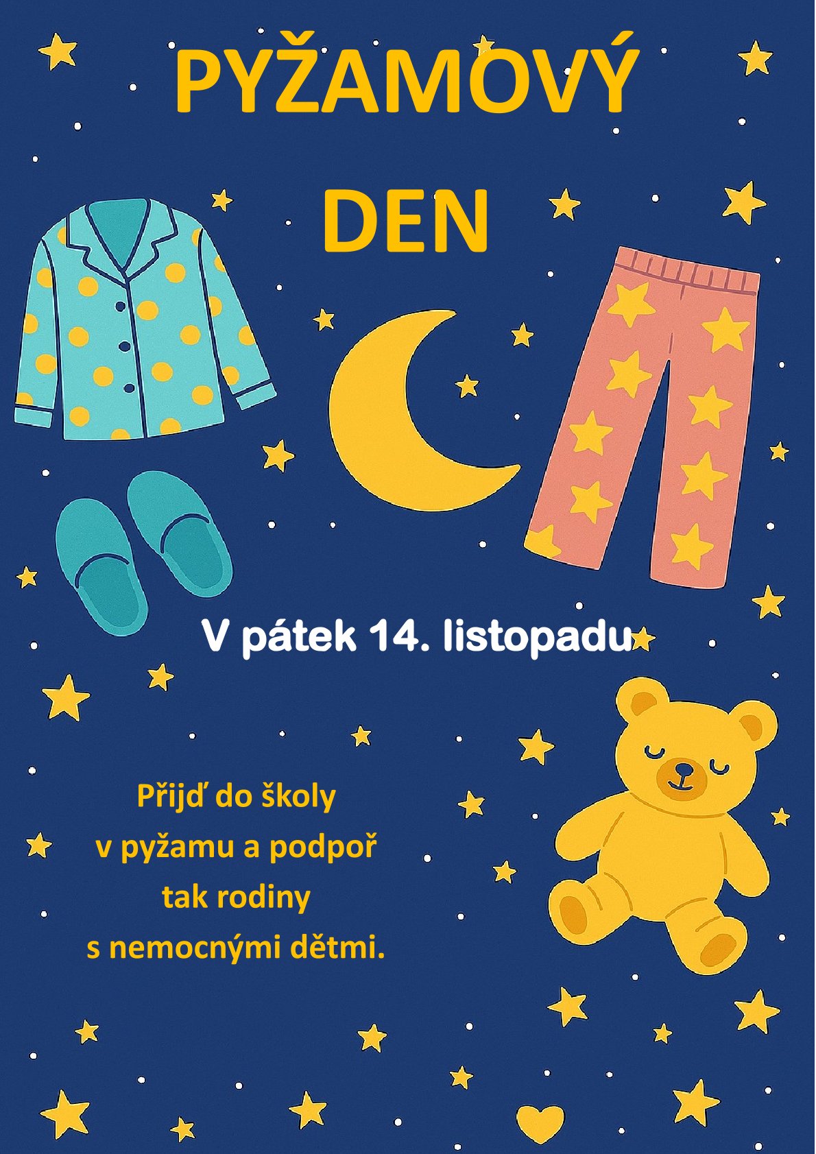 Obleč si do školy oblíbené pyžamo a pomoz rodinám s nemocnými dětmi. V pátek 14. 11. vyměníme naše každodenní outfity za pyžamo. Pyžamový den je akce, která ukazuje, že i malý krok může pomoci. Cílem je připomenout, že pro některé děti není pyžamo volbou, ale nutností, protože tráví dlouhé dny v nemocnici. Připoj se a ukaž rodinám těchto dětí, že na to nejsou samy.